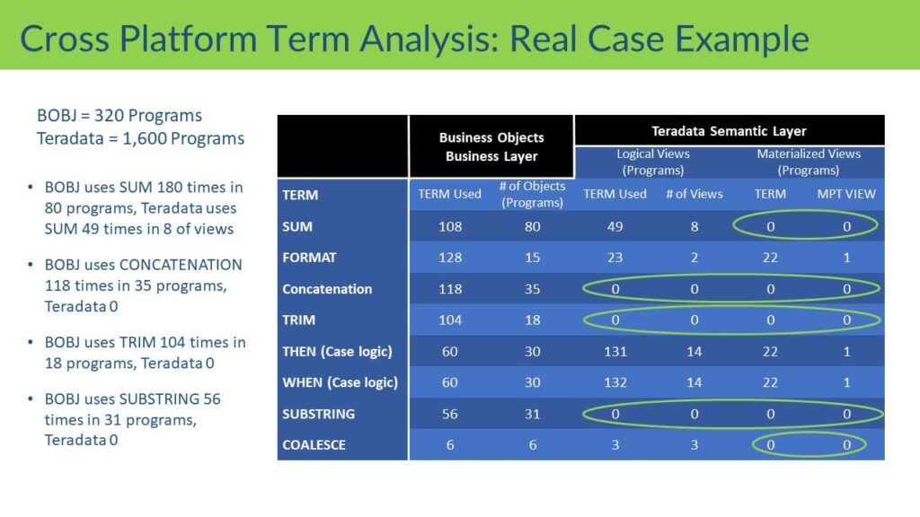 “You can’t read all the lines of code to see where the ‘heavy lifting’ is – it’s impossible because of sheer scale and knowledge needed for different platforms. Instead, our process works because it uses data science and text mining to consume thousands of programs and analyze the word usage in the language (SQL or any language). I’ve developed a dictionary for very specific words that I know characteristically are ‘resource pigs.’ These words demonstrate a lack of proper planning – they just consume a ton of resources on one platform versus the optimal use of both platforms.”